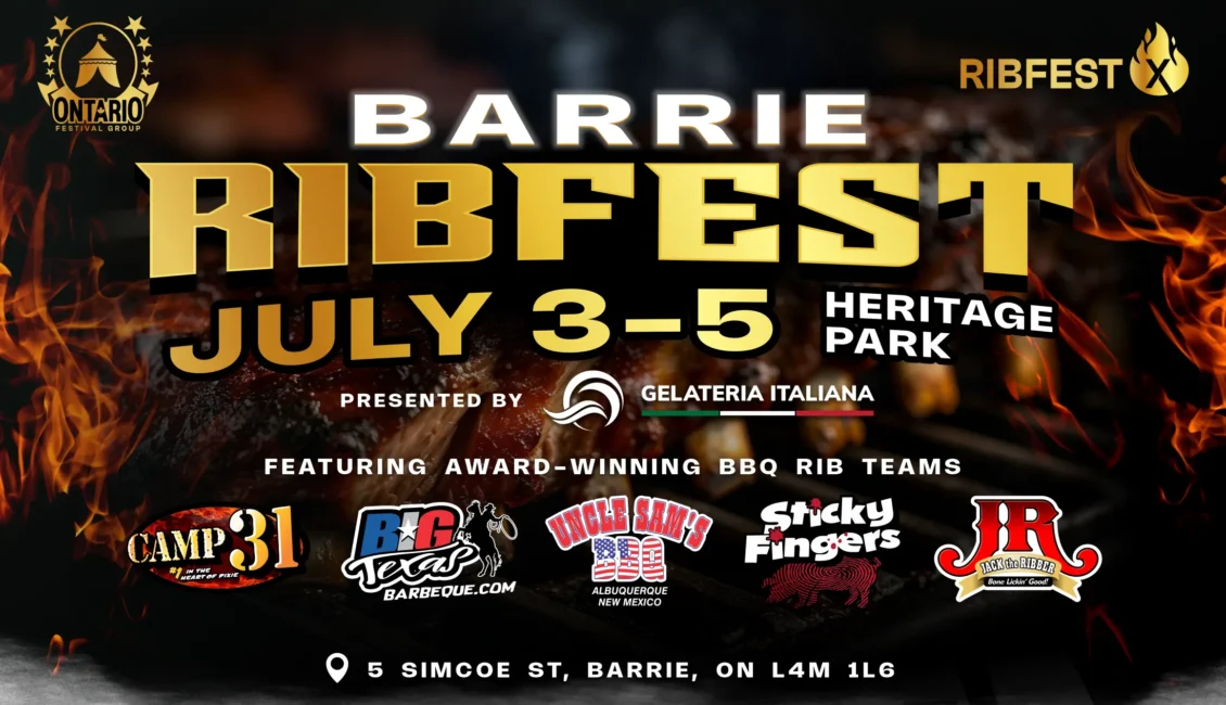 The Barrie Ribfest X 2026 is presented by Gelateria Italiana and will take place on Friday, July 3 to Sunday, July 5, 2026 held at Heritage Park (Barrie’s waterfront) in Barrie. We are bringing North America’s Best Rib Teams. These “Pitmasters” are ready to serve you and your friends Award-Winning, Mouth-Watering BBQ Smoked Ribs, Tender Pulled Pork, Juicy Smoked Brisket, BBQ Chicken, Smoked Sausage and those huge Beef “Dino” Ribs. produced by Ontario Festival Group.