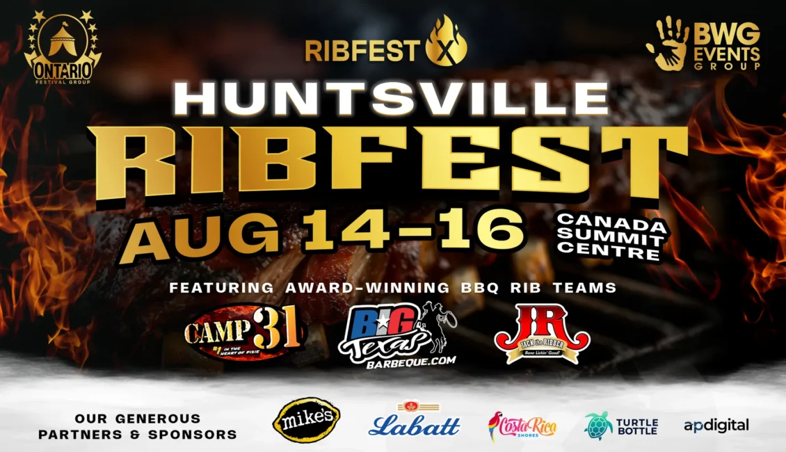 The Huntsville Ribfest X 2026 will take place Friday, Aug 14 to Sunday, Aug 16 2026 at the Canada Summit Centre, Huntsville, convenient for area residents and visitors from all over! We are bringing North America’s Best Rib Teams. These “Pitmasters” are ready to serve you and your friends Award-Winning, Mouth-Watering BBQ Smoked Ribs, Tender Pulled Pork, Juicy Smoked Brisket, BBQ Chicken, Smoked Sausage and those huge Beef “Dino” Ribs. Produced by Ontario Festival Group.